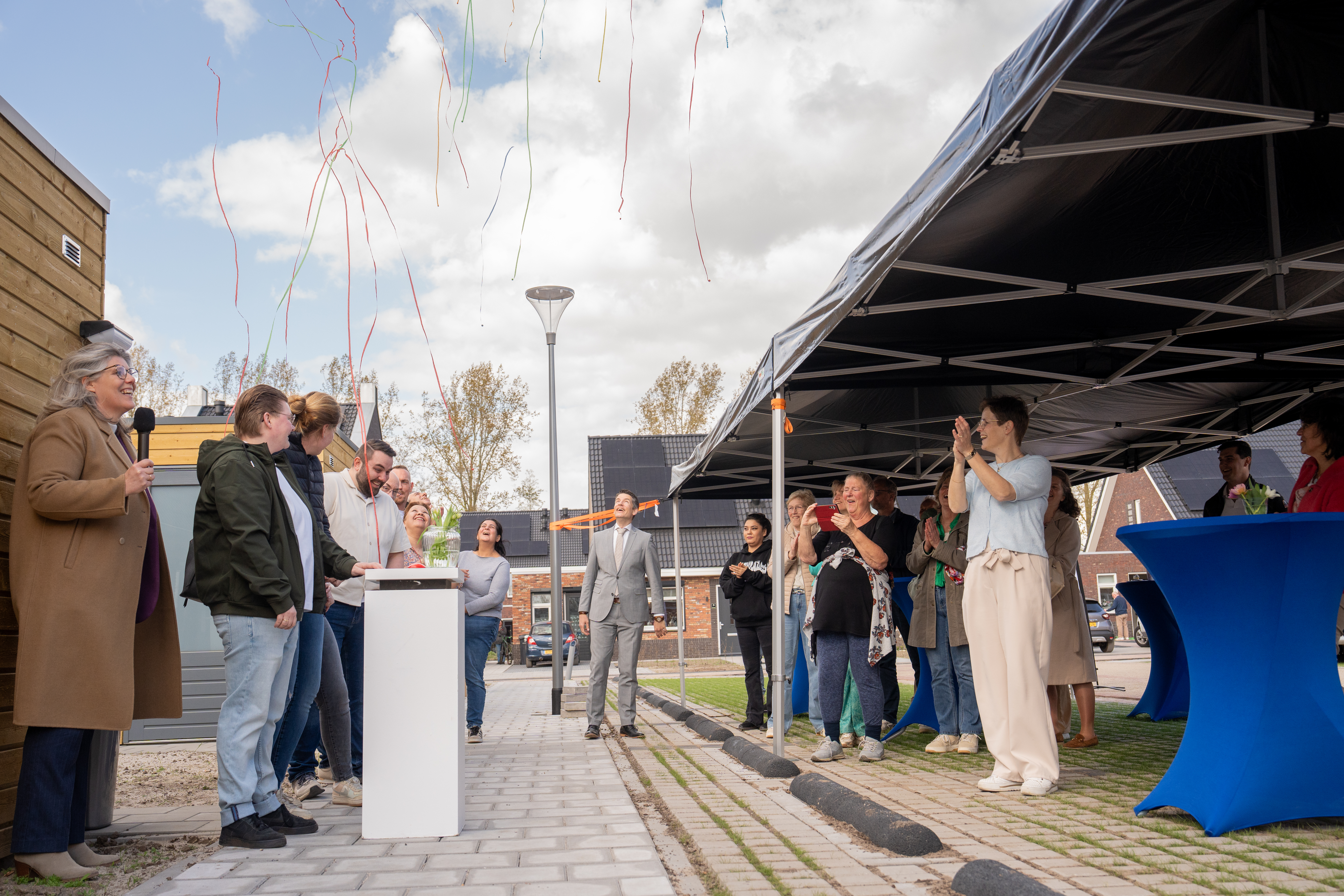 Blije gezichten gisteren bij de oplevering van onze acht nieuwe woningen in de wijk Opbroek in Rijssen. Met een druk op de knop zorgde de familie Stinissen voor een feestelijke confettiregen voor hun nieuwe woning. Samen met de andere nieuwe huurders, Bouwbedrijf Ter Harmsel, de collega's en wethouder Erik Wessels vierden we deze mijlpaal.